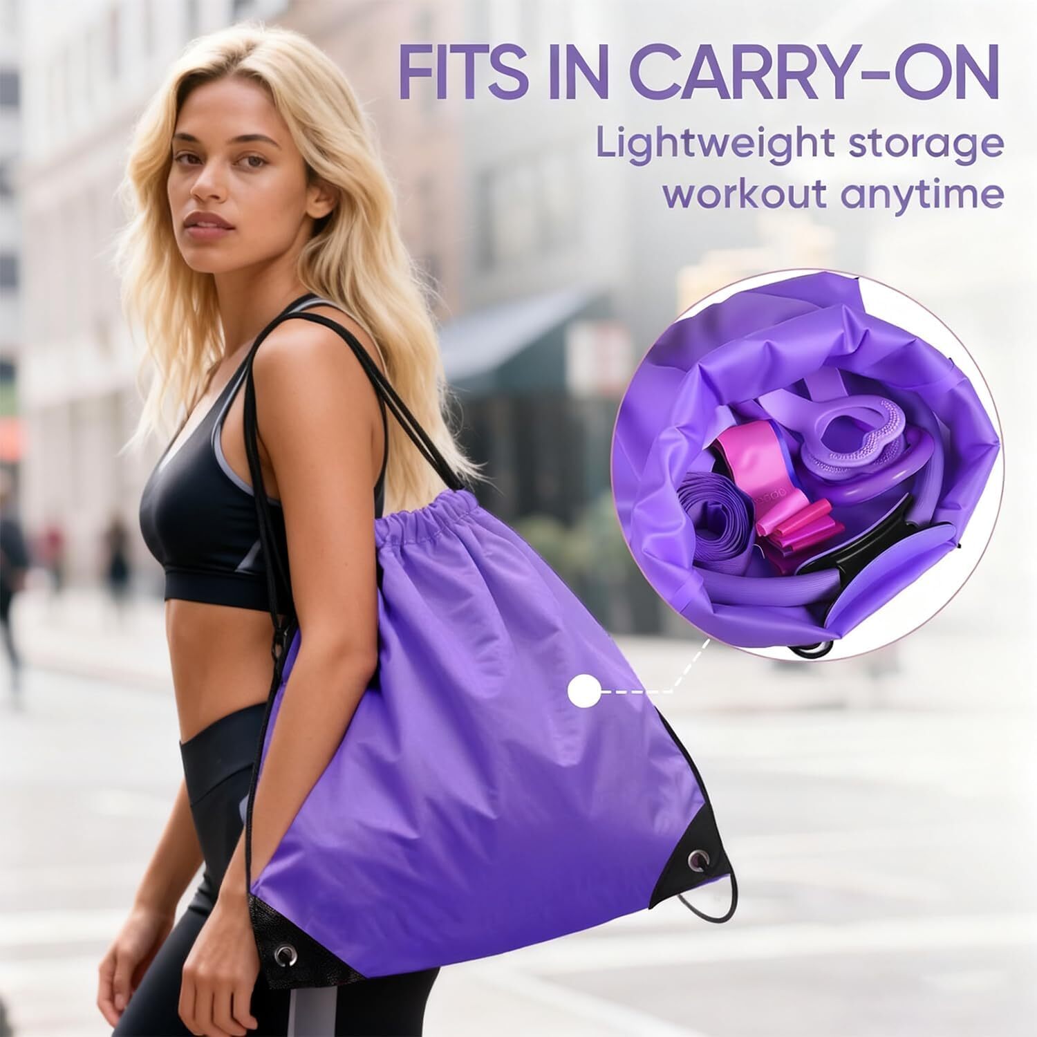 All pilates accessories fit in the included drawstring bag. Lightweight yet complete, this home pilates kit transforms any space into a workout studio - great for apartments, travel, or gym sessions.
