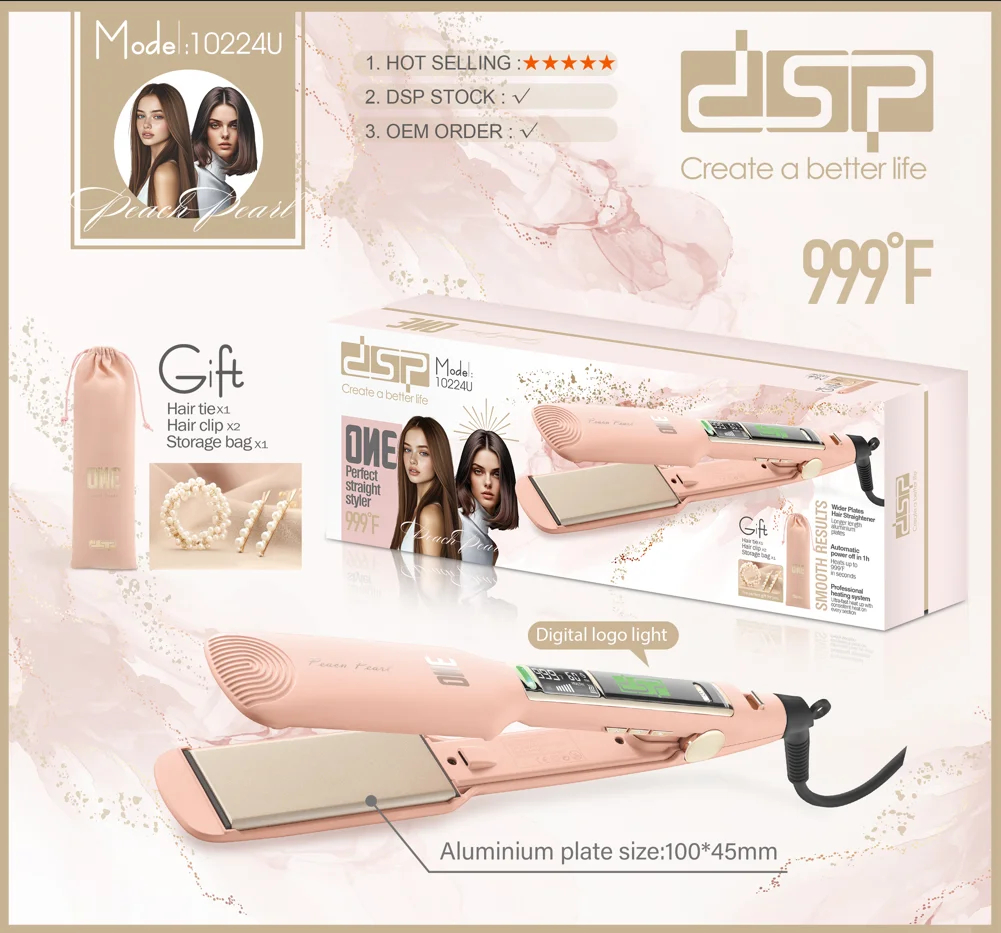 DSPThe DSP 10224U Hair Straightener delivers smooth, sleek, and frizz-free styling with professional results. Featuring ceramic-coated plates, ionic anti-frizz technology, and adjustable temperature control, it protects hair from heat damage while enhancing shine and smoothness. Lightweight, fast-heating, and suitable for all hair types — ideal for home, salon, or travel use.