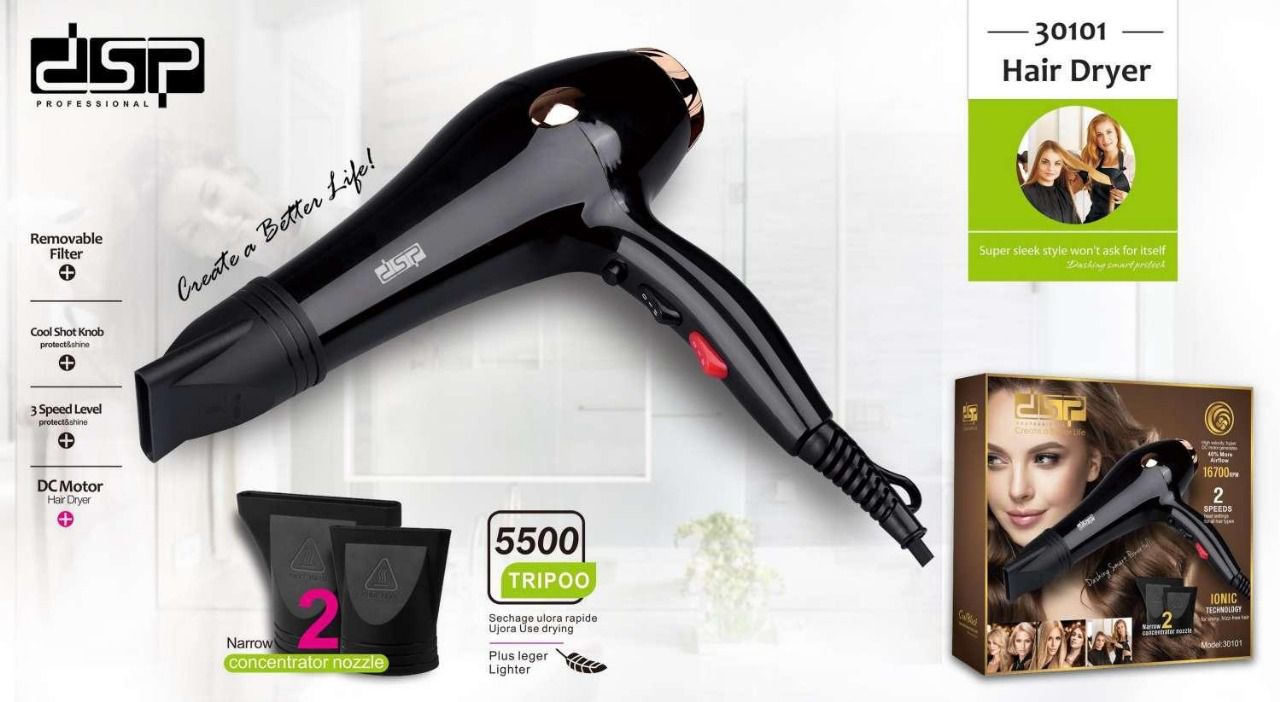 DSPThe DSP 30101 Hair Dryer 1600W offers fast, smooth, and gentle drying with ionic anti-frizz technology. Lightweight and efficient, it features multiple heat and speed settings for precise styling while protecting hair from heat damage. Ideal for everyday home use, travel, or professional grooming.