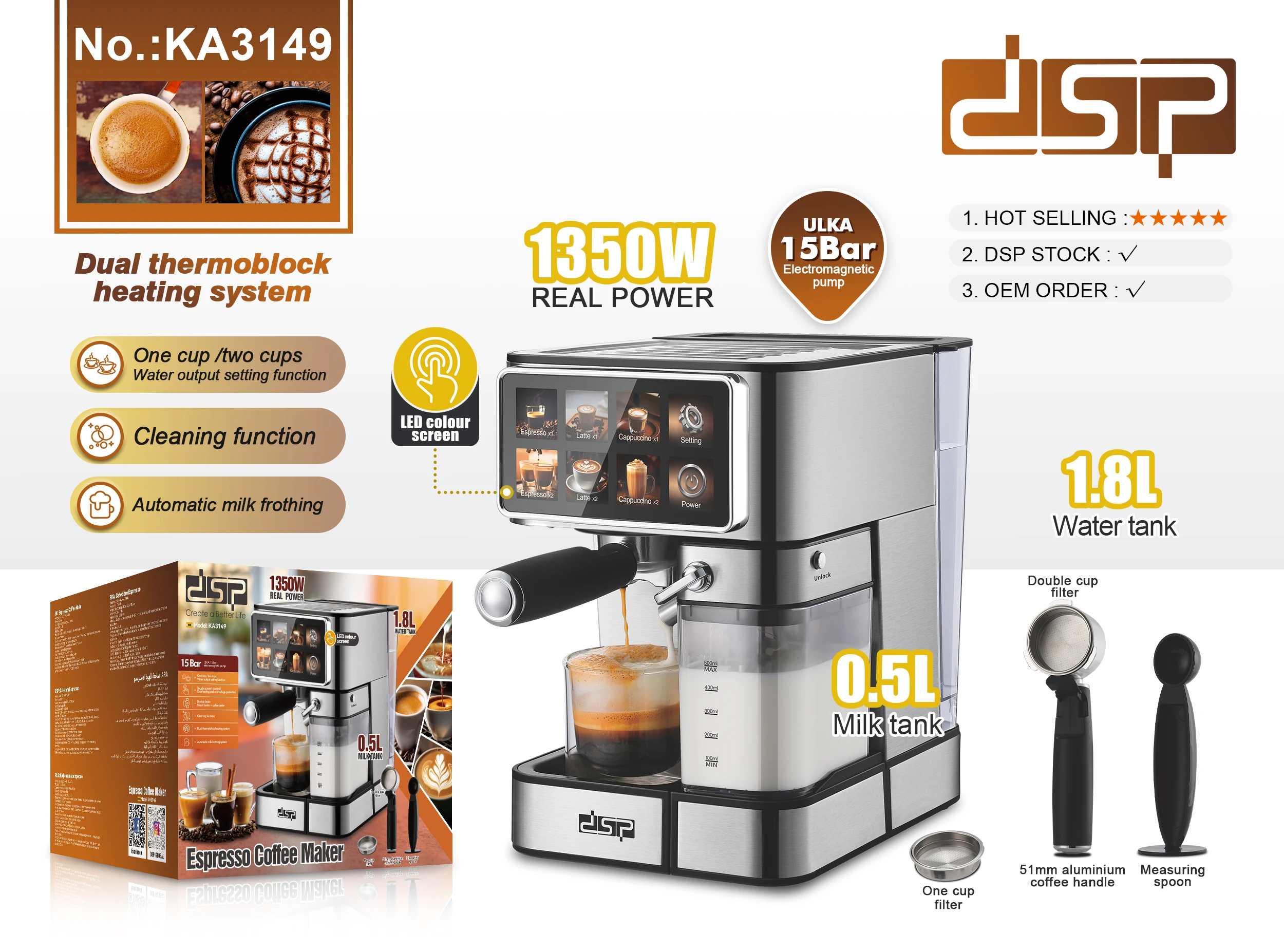 DSPThe DSP KA3149 Espresso Coffee Maker is designed for coffee lovers who want rich, flavorful espresso at home or in the office. With efficient brewing performance and user-friendly operation, it delivers consistent pressure for smooth espresso extraction. Its compact design fits easily on kitchen counters while providing reliable daily coffee preparation with minimal effort.