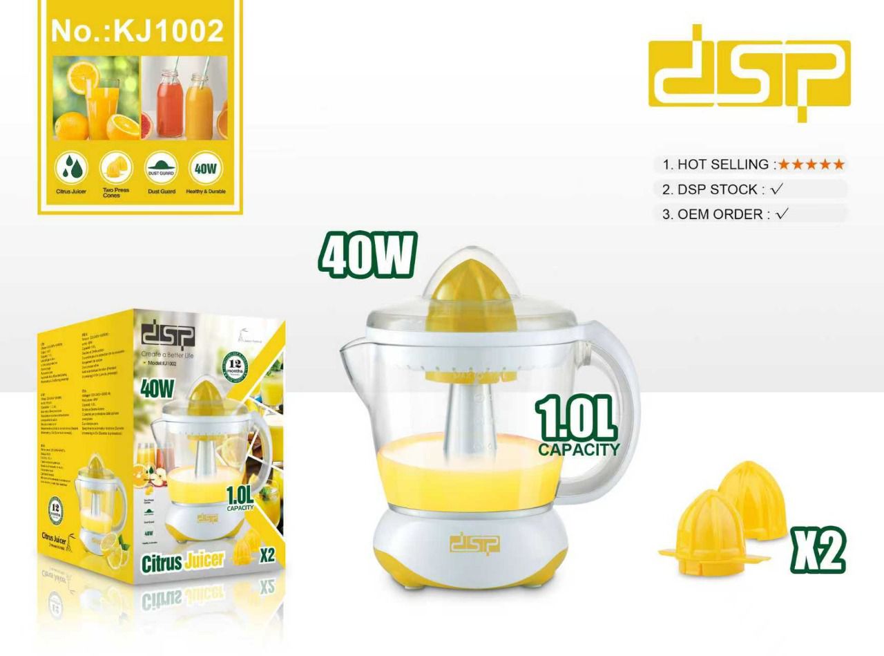 DSPThe DSP KJ1002 One Press Cone Citrus Juicer is a practical and efficient appliance designed for easy extraction of fresh citrus juice. With a 40W motor and one-press operation, it delivers smooth and consistent juicing for oranges, lemons, and other citrus fruits. Its 1-liter capacity and compact design make it ideal for daily home use, offering convenience, easy cleaning, and reliable performance.