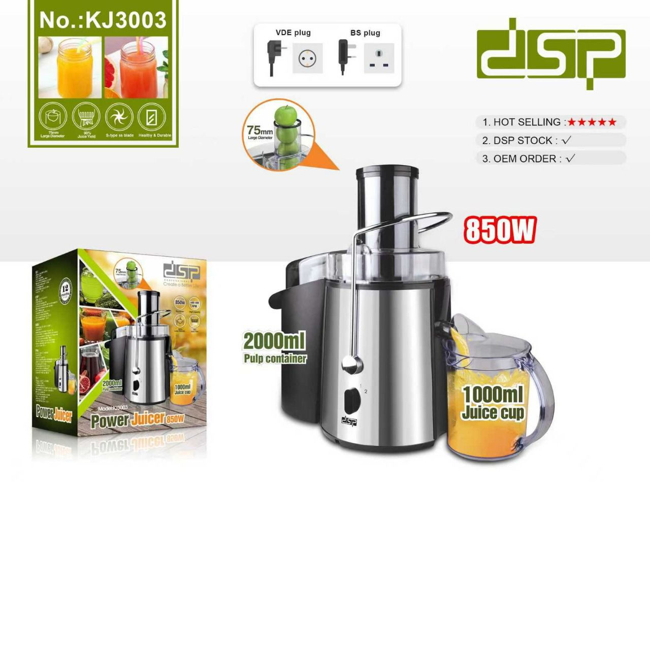 DSPThe DSP KJ3003 Power Juicer is a high-performance juicing machine designed to extract maximum juice and nutrients from fruits and vegetables with powerful efficiency. Featuring a strong motor, stainless steel cutting blades, and a wide feeding tube, it delivers fresh, smooth juice in seconds. Easy to clean, durable, and perfect for daily healthy living at home.