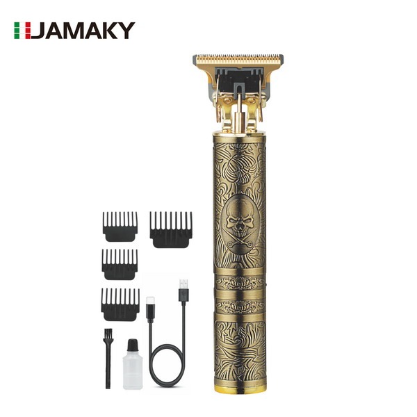 JamackyThe Jamakky JPC90028 Pro Hair Trimmer is a high-performance professional grooming tool designed for precise hair trimming, outlining, and styling. Powered by a strong 7500 RPM motor and equipped with sharp stainless steel T-blade, it delivers smooth, clean, and accurate cuts for barbers and home users alike. With a 600mAh lithium battery, fast charging, and up to 80 minutes of working time, it ensures reliable cordless performance. Its premium engraved metal body offers durability, luxury appearance, and a comfortable grip for long grooming sessions.